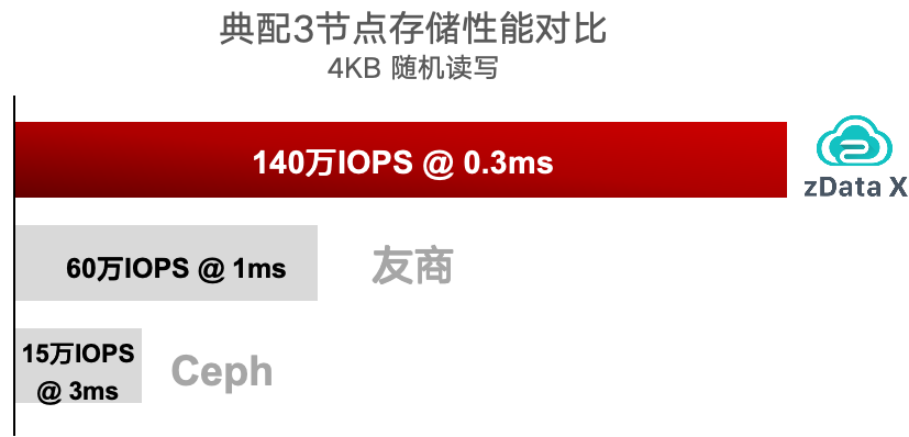 基于全闪存分布式存储软件 zStorage,单节点4KB随机读写(7:3)大于45万IOPS,并且在IOPS达到峰值时平均时延<0.3ms; -