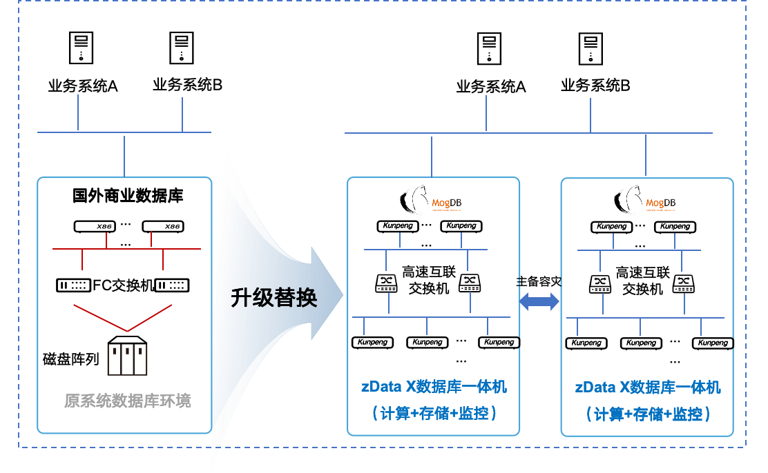 某省卫健委为响应全栈国产化信创改造要求、适应业务激增压力需求,决定采用 zDataX 替换原有老旧设备,同时将国外商业数据库升级替换为云和恩墨基于 openGauss 内核研发的企业级数据库 MogDB,并搭载基于鲲鹏架构的服务器作为计算、存储和监控节点,构建全栈国产数据库资源池。zData X 上线后,用户业务系统数据库访问效率明显提升,通过迁移前后的性能指标对比,带宽性能提升16倍以上,IOPS性能提升13倍以上。