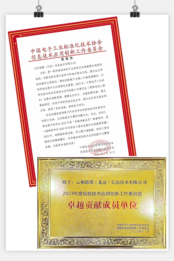 2023年,中国电子工业标准化技术协会信息技术应用创新工作委员会(简称:信创工委会)在聚合创新资源、凝聚生态合力、加强供需对接、强化基础研究、促进产学研用金交流合作、提升成员单位服务等方面,取得了良好成效。此过程中,云和恩墨对信创工委会工作的鼎力支持和重要贡献得到了工委会的高度认可和感谢,因此荣获2023年度“卓越贡献成员”称号,这也是继2022年度后公司连续第二年获此殊荣。这一荣誉不仅是对云和恩墨过去一年努力的肯定,也是对公司未来继续发挥创新引领作用的期许。