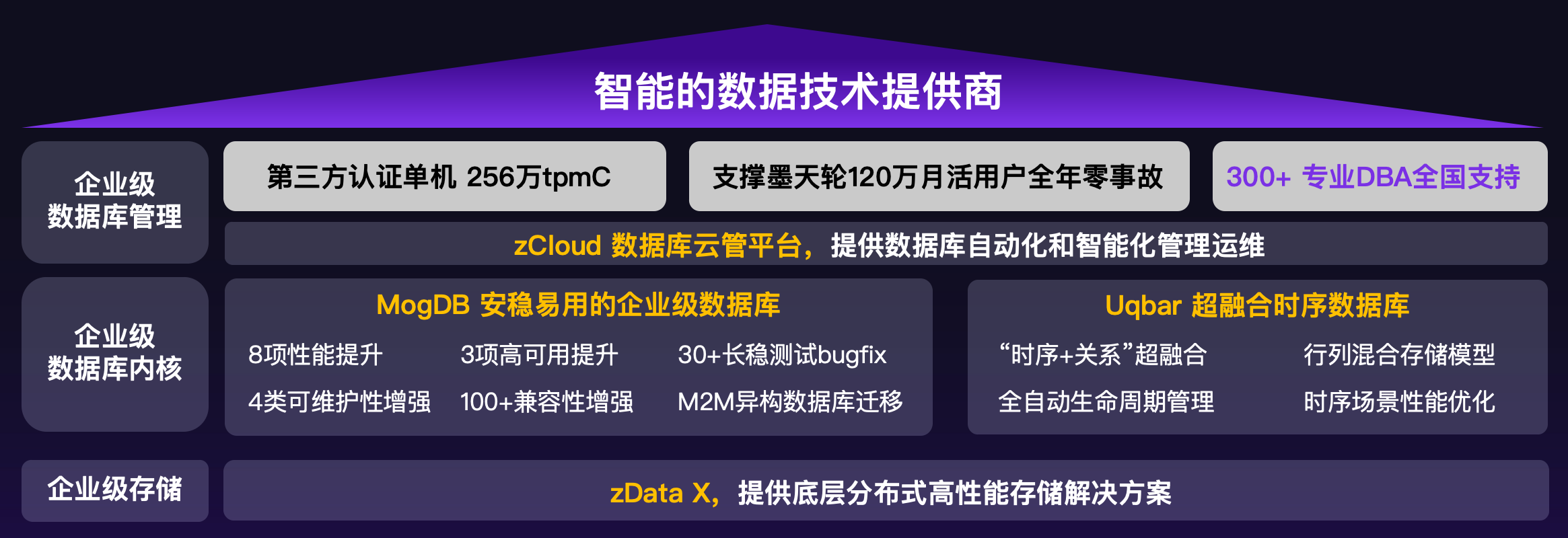 “未来的世界是智能世界,智能世界的驱动力是数据。我们将自己定位成智能的数据技术提供商,助力用户实现数据驱动的智能未来。在这个愿景下,云和恩墨正在加倍努力,一步一步将智能的数据技术带到我们的产品中来,助力用户数字化建设和智能化演进。”盖国强最后说。