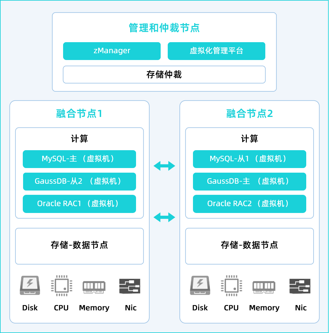 该架构本质是极致精简的“融合”——依托虚拟化技术在两台物理服务器上运行多种数据库,即使在仅有两个数据节点的情况下,仍能通过存储仲裁机制保障数据一致性与高可用性。其优势在于起步成本低、部署简便,对机房环境要求不高,且具备完备的高可用能力,支持故障自动切换。虽然此种形态在架构上类似Oracle ODA,但其胜在可以承载多种商业或开源数据库。