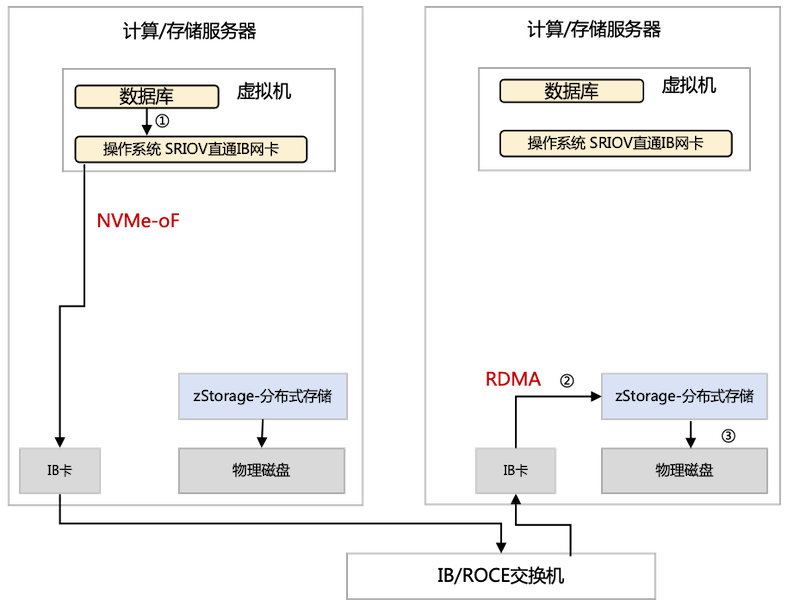 zData X一体机选择了一条更“激进”的技术路线:通过SR-IOV让虚拟机直通IB网卡,并结合RDMA高速互联技术与NVMe-oF协议,使虚拟机访问存储的IO路径缩短至3跳。这意味着,数据库即便运行在虚拟机中,其IO性能也接近物理机直连存储的效果。