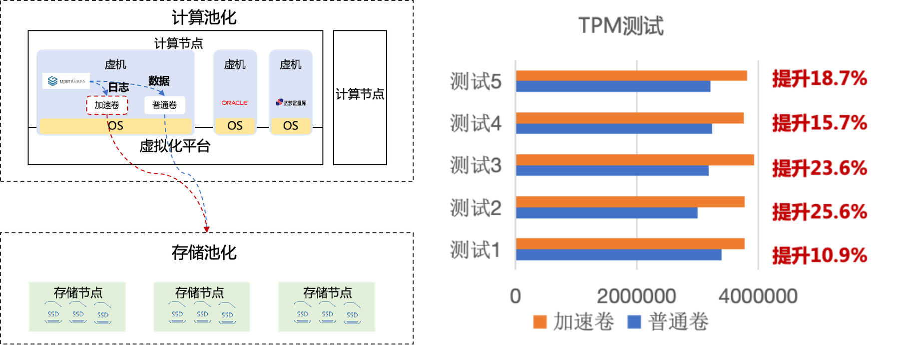 从测试结果来看,加速卷在多次TPM测试中为数据库带来了接近20%的性能提升。更重要的是,这种能力使得企业无需再为少数关键系统单独建设“高配孤岛”,而是在统一平台内实现差异化保障。关键系统获得性能,整体平台却保持高整合度,成本自然被摊薄。