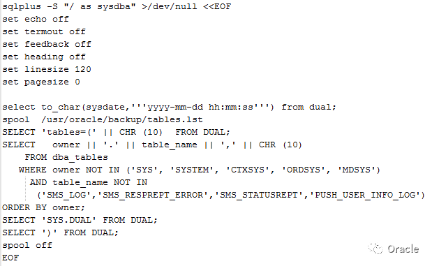 首先创建一个Shell脚本(本例脚本名为tables.sh),这个脚本用于动态生成一个需要备份的数据表列表文件tables.lst,在查询语句中,就可以排除不需要备份的用户或特定数据表,不需要备份的表应该有限,所以维护这个查询应该容易得多:
