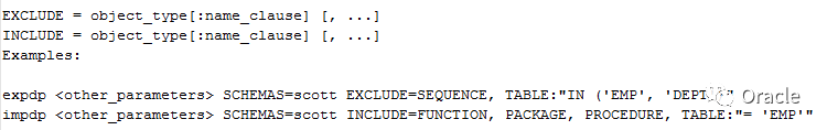 EXCLUDE:排除特定的对象类型, 例如EXCLUDE=TABLE:EMP。