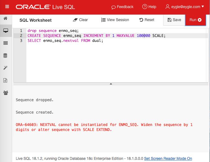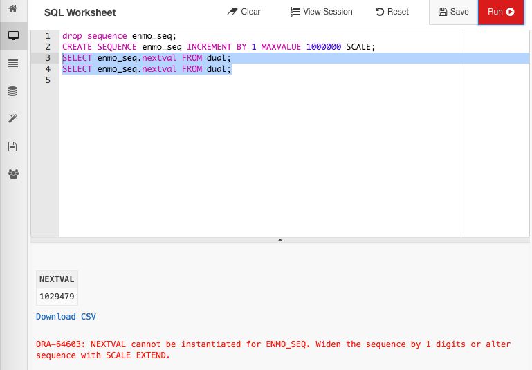 ORA-64603: NEXTVAL cannot be instantiated for ENMO_SEQ. Widen the sequence by 1 digits or alter sequence with SCALE EXTEND.